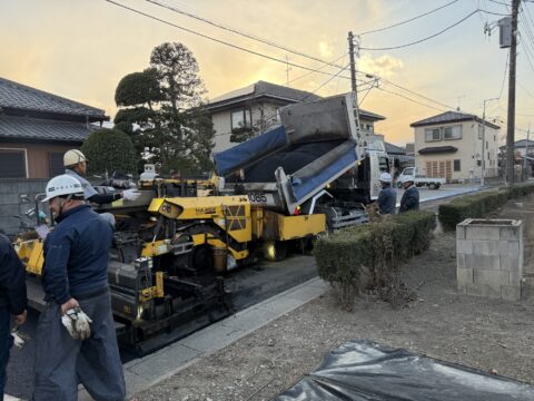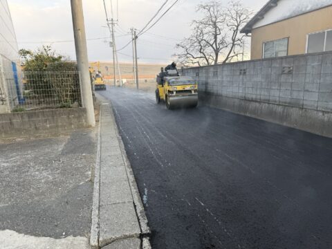 - 狭隘(きょうあい)道路への対応: 大型重機の配置を工夫し、限られたスペースの中でミリ単位の丁寧な舗装を行いました。